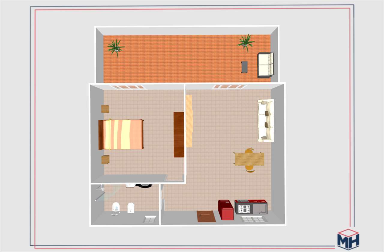 Entrando nell'appartamento troviamo un ambiente accogliente e luminoso, composto dal soggiorno con cucina a vista, dal quale si accede al generoso terrazzo della proprietà.