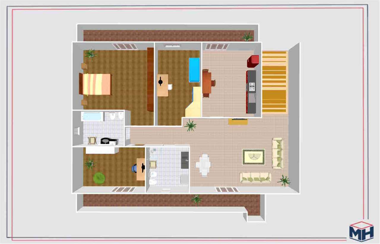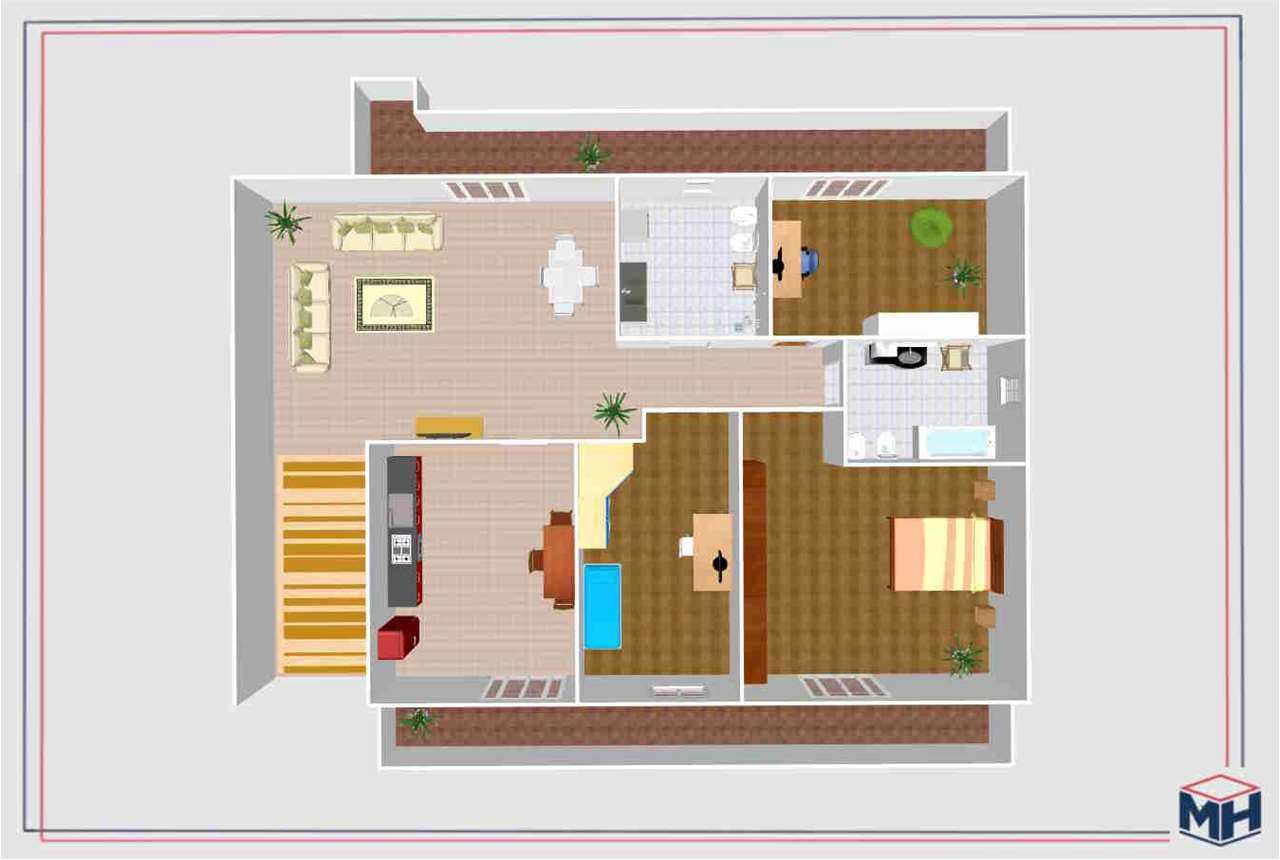 Entrando nell'abitazione troviamo la zona giorno dove vi sono il soggiorno e la cucina abitabile, entrambi con accesso al proprio terrazzo;